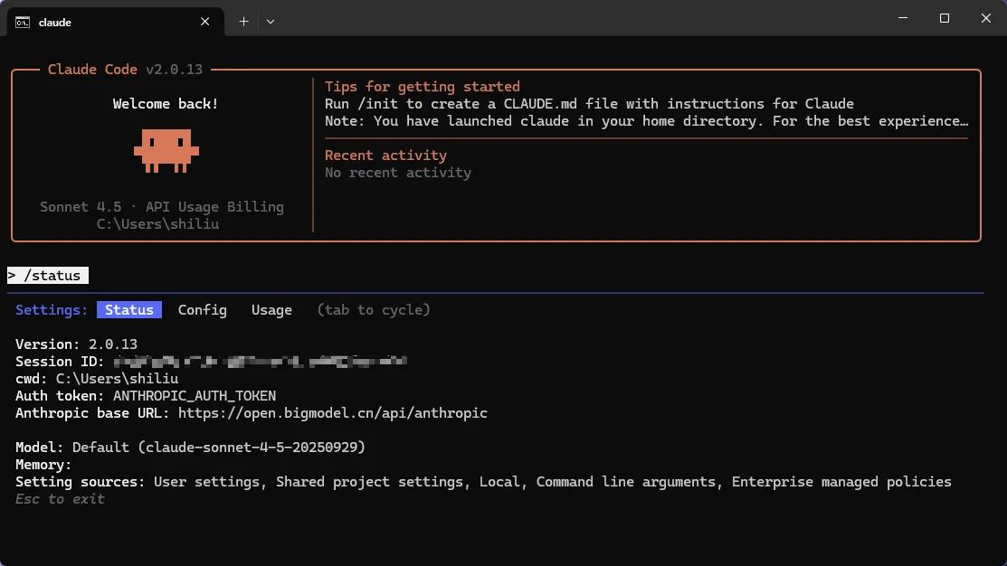 在 claude code 中输入/status可以确认模型状态: