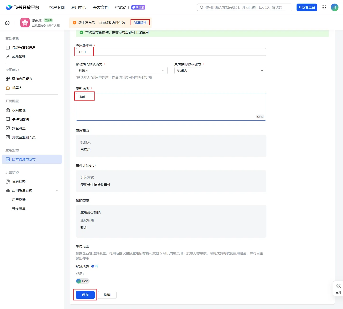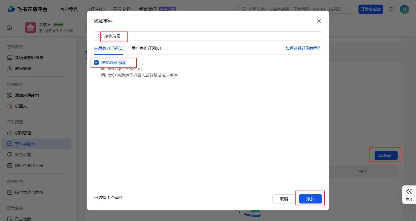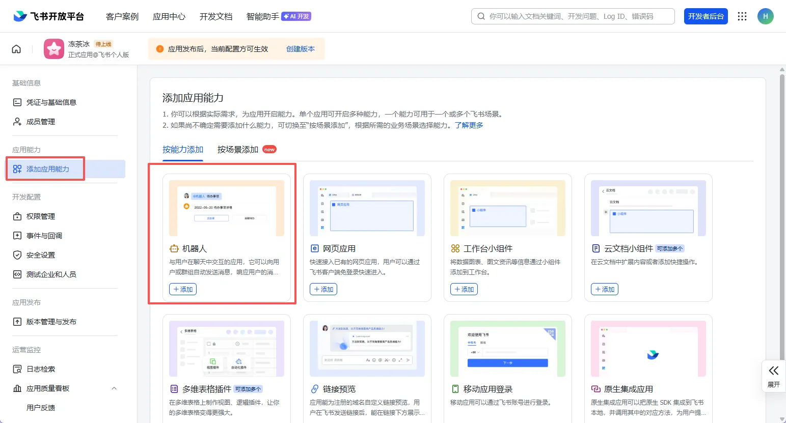 创建应用后,点击左侧菜单:添加应用能力,然后选择机器人,点击添加