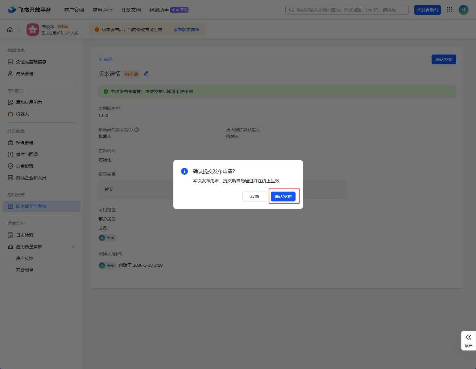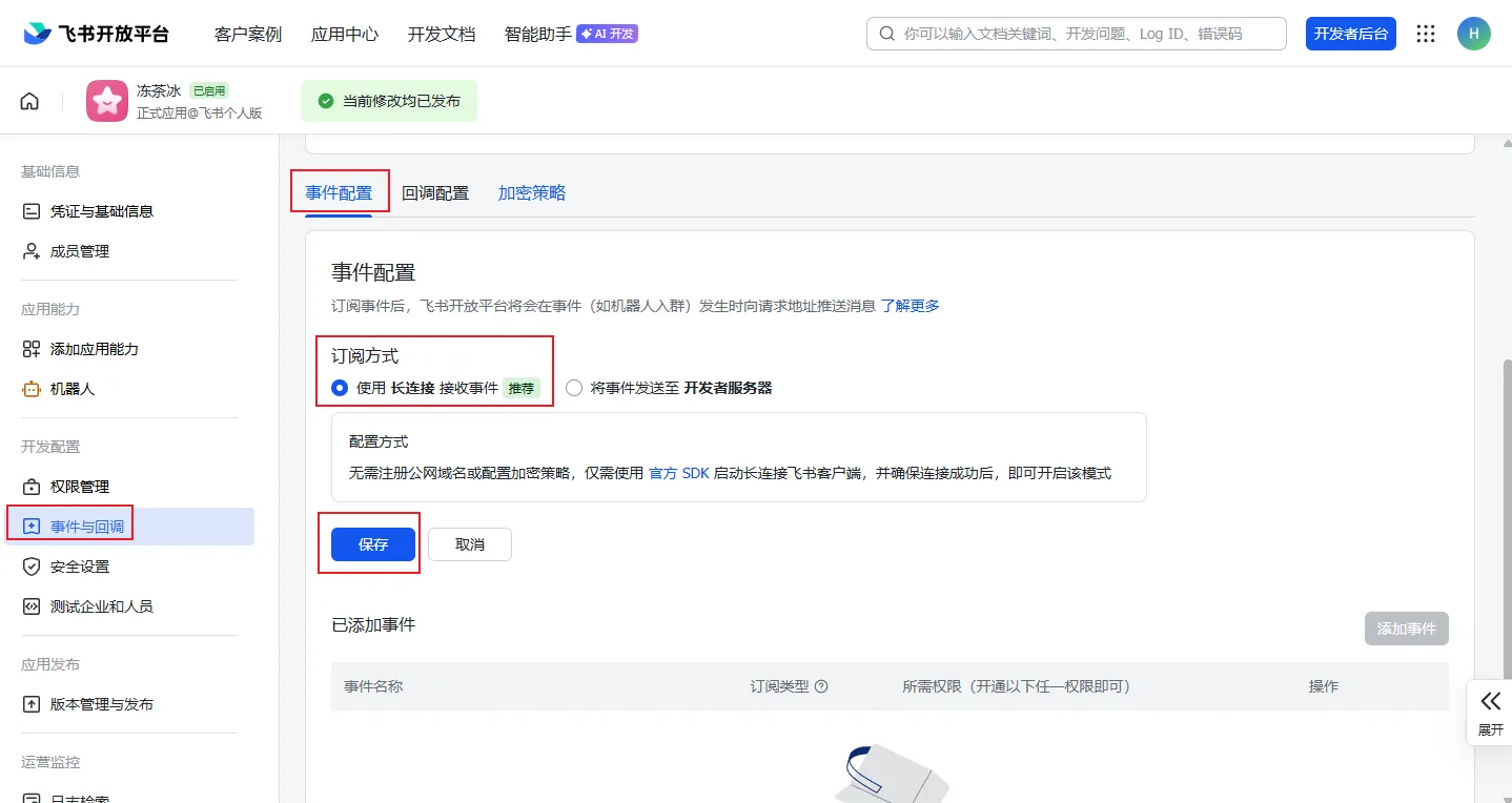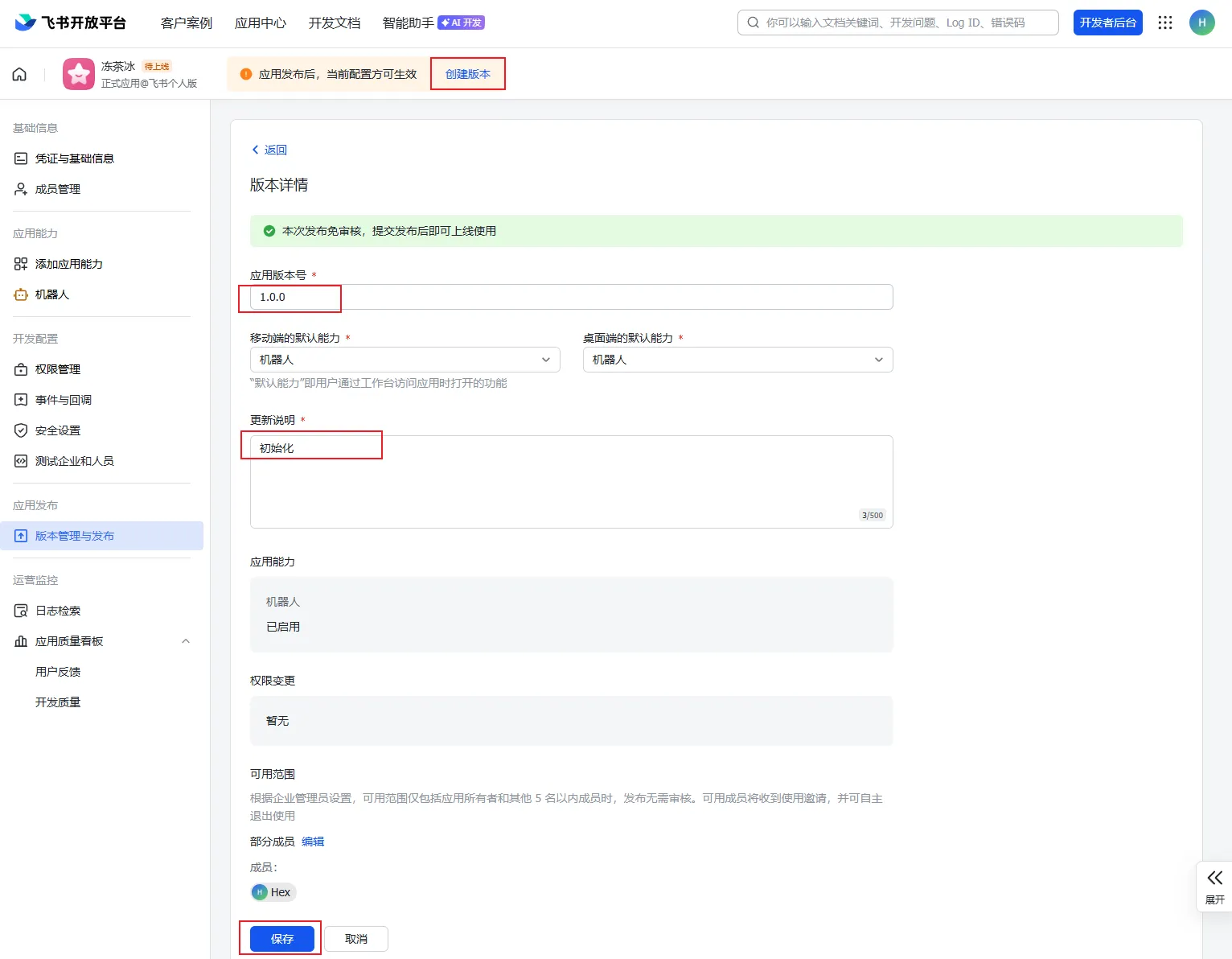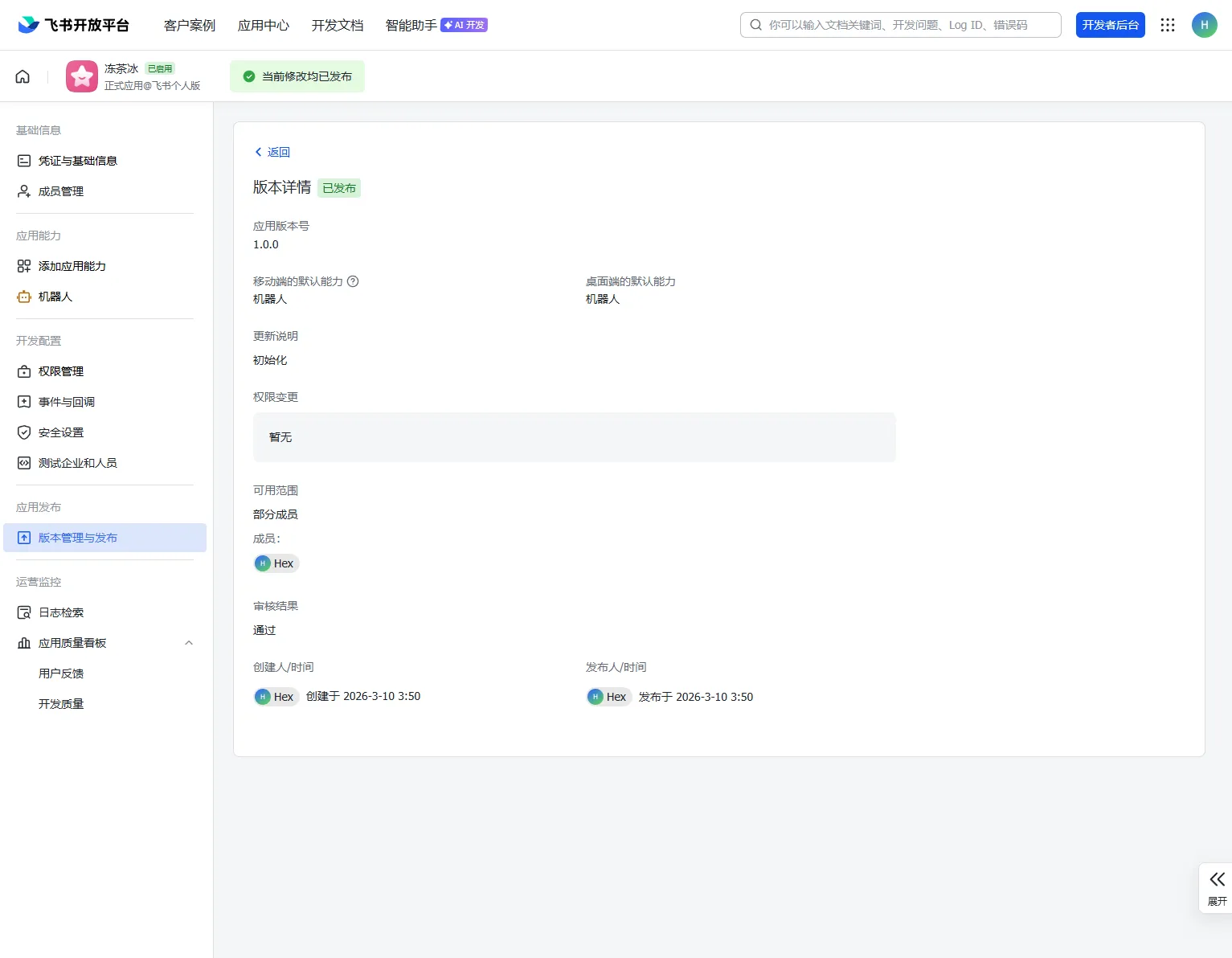 创建应用后,点击左侧菜单:添加应用能力,然后选择机器人,点击添加