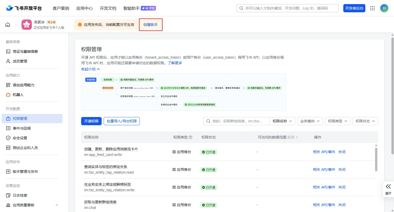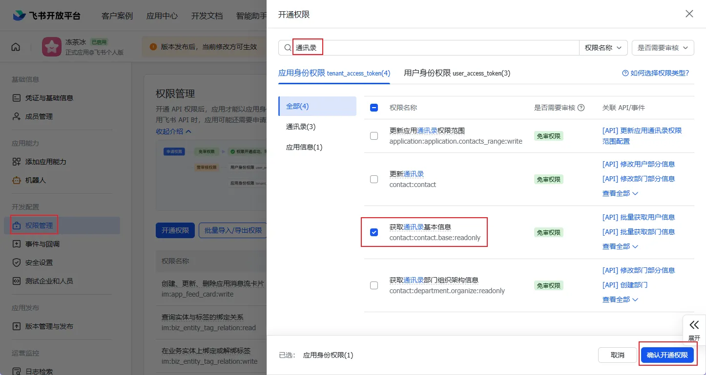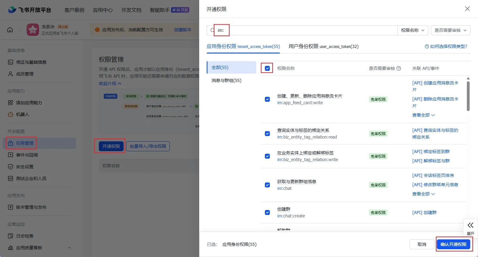 点击左侧菜单:权限管理,再点击界面中的开通权限,输入im:,全部勾选后,点击确认开通权限: