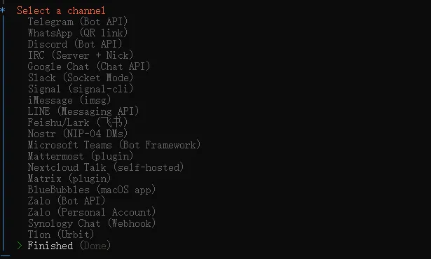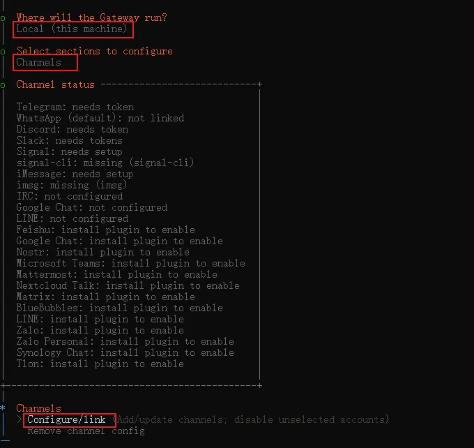 回到 powershell,执行openclaw config命令,添加新的消息渠道: