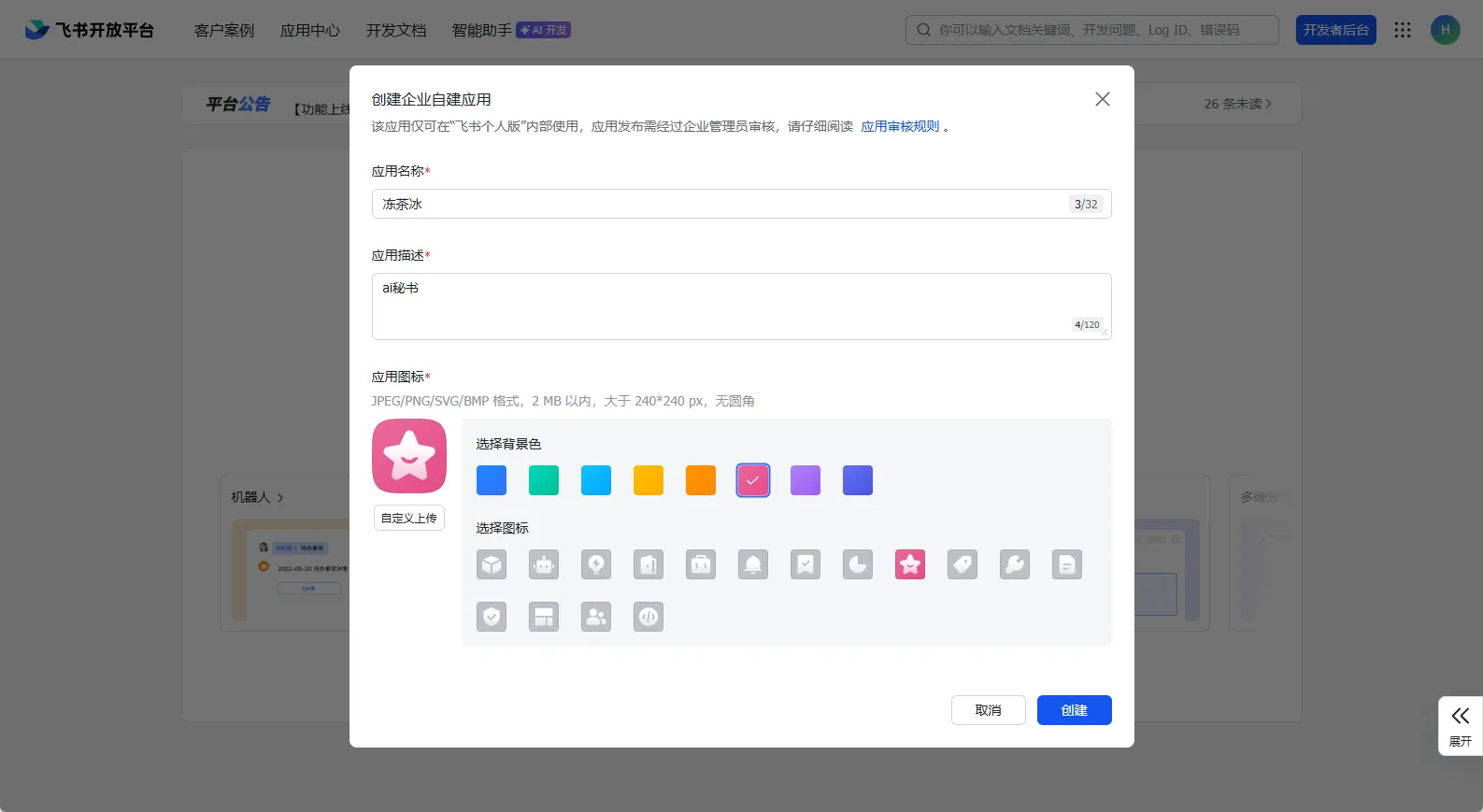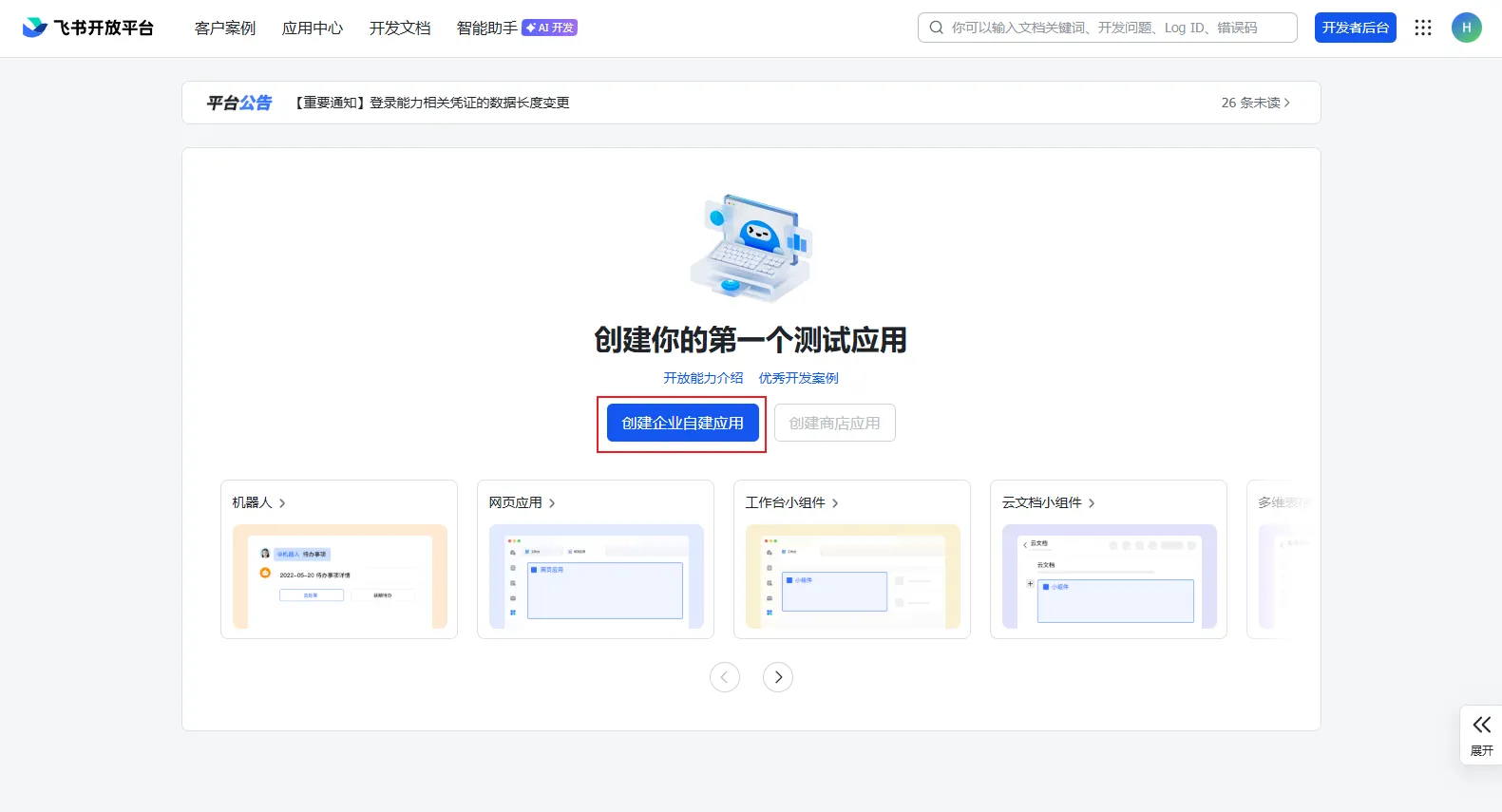 登录飞书开放平台:https://open.feishu.cn/app,点击创建企业自建应用: