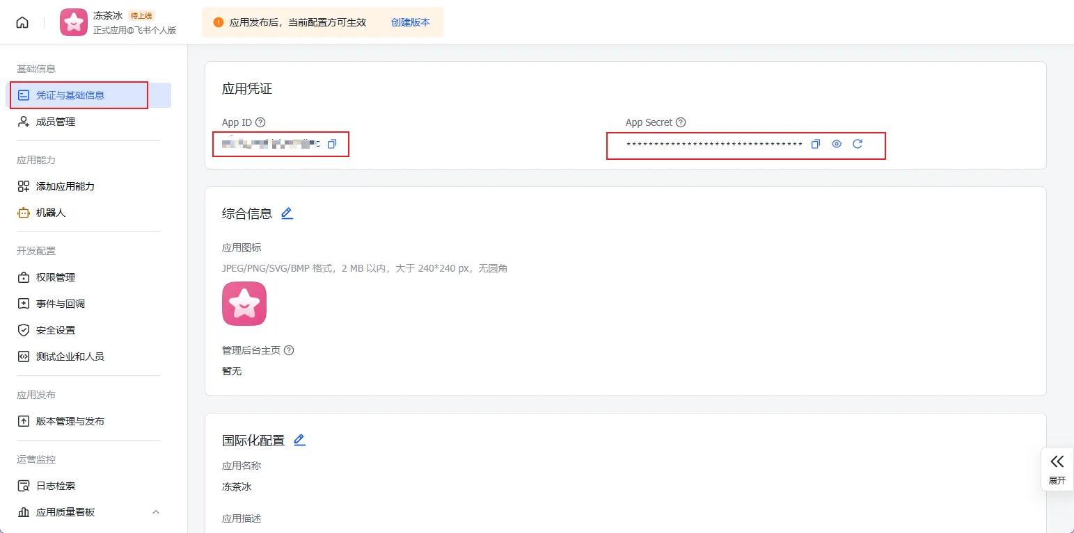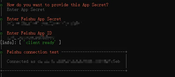 复制 AppID 和 AppSecret,粘贴到命令行飞书配置即可: