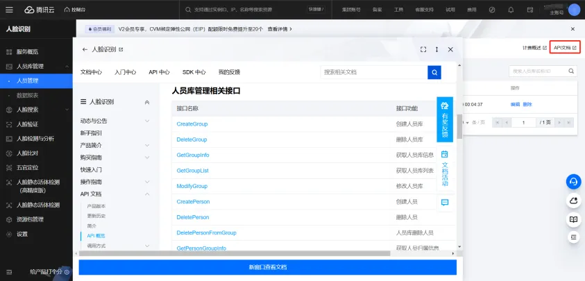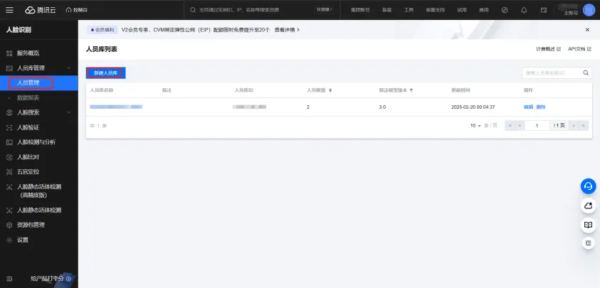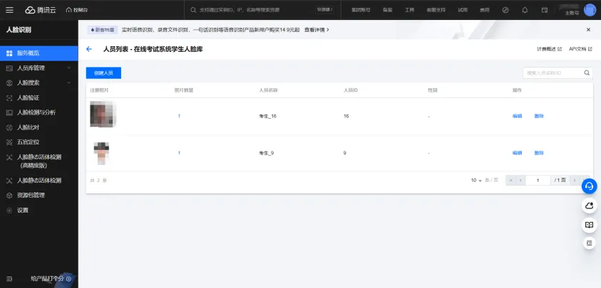 录入成功后可以再腾讯云 -> 人脸识别控制台 -> 人脸库 看到录入的人脸: